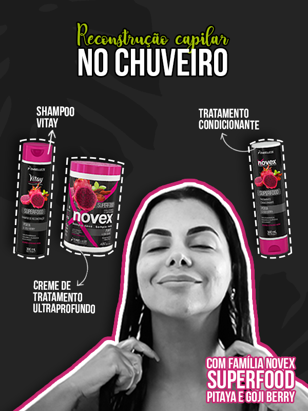A Família SuperFood da Embelleze já é a melhor amiga do cronograma capilar. Seus dois primeiros lançamentos foram para HIDRATAÇÃO (Família Novex SuperFood Maracujá e Mirtilo) e NUTRIÇÃO (Família Novex SuperFood Cacau e Amêndoas). E agora a etapa de RECONSTRUÇÃO está garantida com a Família Novex SuperFood Pitaya e Goji Berry.