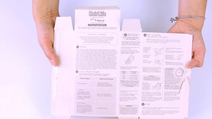 Dentro de cada caixa do HairLife vem 1 creme de transformação, 1 neutralizante e 1 par de luvas, e o passo a passo completo vem impresso dentro da caixa.